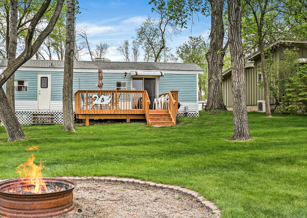 Step through the sliding door and land on a private deck with charcoal grill, picnic table, and lakeside firepit. Bring morning coffee out here—the sunrise lifts straight over the water.