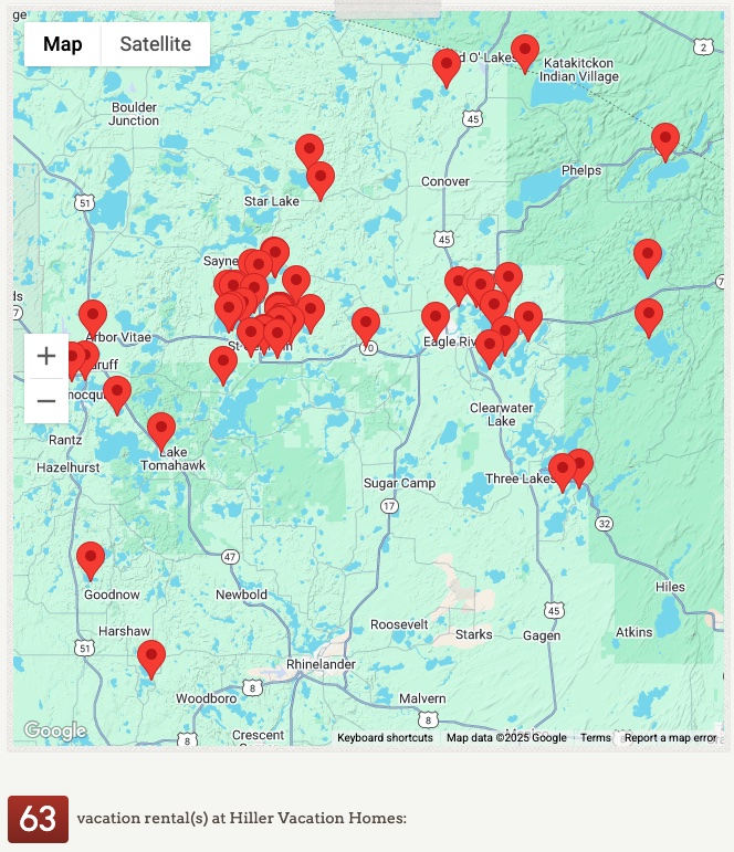 Eagle River, WI has a big collection of area stays (cabins, cottages, resorts, homes) and leans hard into booking direct—which is very Cabin Joe-approved.