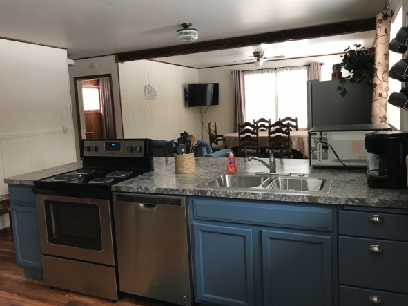 The kitchen is set for group meals with seating for 8 at the pine table, 4 at the high‑top, and another 8 outside at the big picnic table/benches. Fire up either grill (gas or charcoal). After dinner, gather at the lakeside fire pit for s’mores and stargazing.