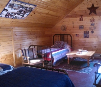 Sidell’s Sturgeon River Log Cabin comfortably sleeps up to 8 guests across four private bedrooms and a loft. Three bedrooms, each on a different level, feature queen-sized beds. The fourth bedroom on the upper level is furnished with bunk beds—a twin-sized bed lofted over a full-sized bed. The loft also includes bunked beds with two twin-sized mattresses, and the living area offers additional sleeping space with a new log couch that folds out to a bed/futon.